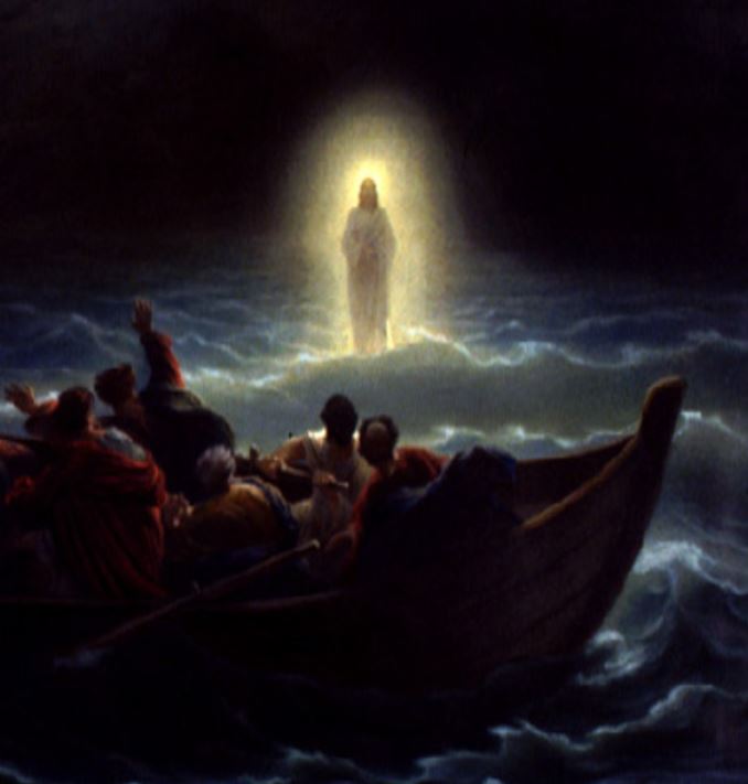 The disciples are in a storm, struggling against the wind, and Jesus comes to them—walking on the water.